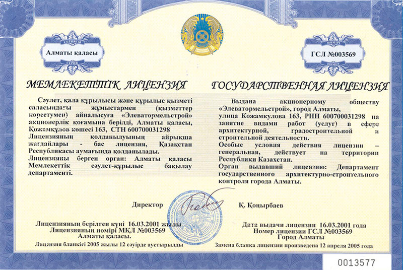Акционерное общество «Элеватормельстрой», в прошлом трест «Южэлеватормельстрой», было создано в 1952 году. Свидетельство о государственной перерегистрации № 2818-1910-АО от 06.05.2004 г., государственная лицензия на занятие «Строительно-монтажные работы» № 04787 от 16.03.2001 г., государственная лицензия на занятие «Эксплуатация горных и химических производств» № 15006402 от 08.04.2015г. с подвидами деятельности – «Вскрытие и разработка месторождений твердых полезных ископаемых открытым и подземным способами» и «добыча твердых полезных ископаемых (за исключением общераспространенных полезных ископаемых)».